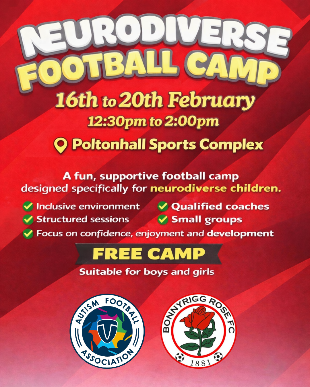 This camp is designed specifically for children with neurodiverse conditions, providing a supportive, inclusive, and enjoyable football environment where players can feel comfortable, confident, and involved.